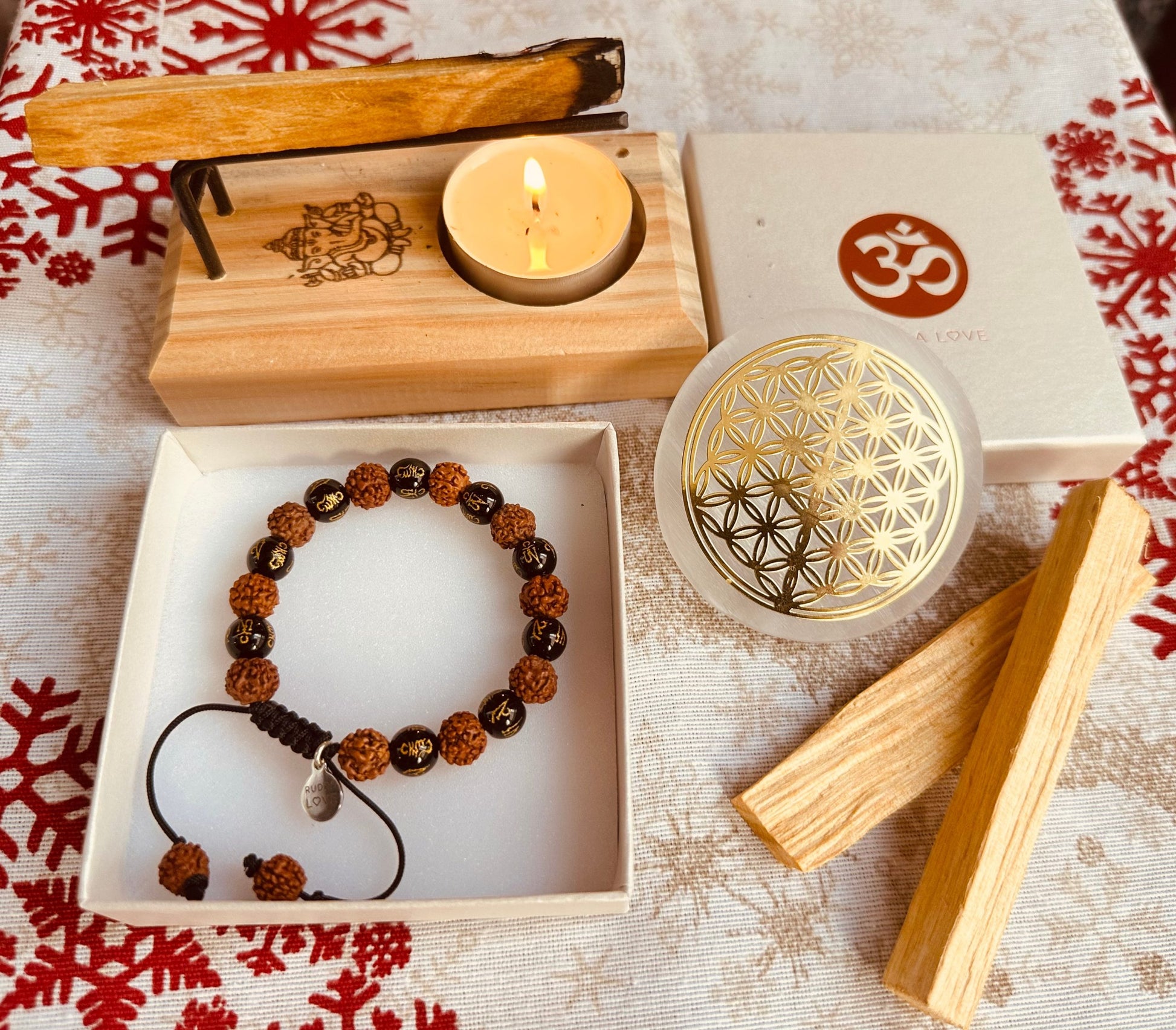 La placa de selenita te ayuda a limpiar energéticamente la pulsera cuando lo necesites, como un gesto de renovación y autocuidado: soltar lo que ya no sirve y abrazar tu fuerza.El quemador con Ganesha sostiene la claridad y el compromiso.