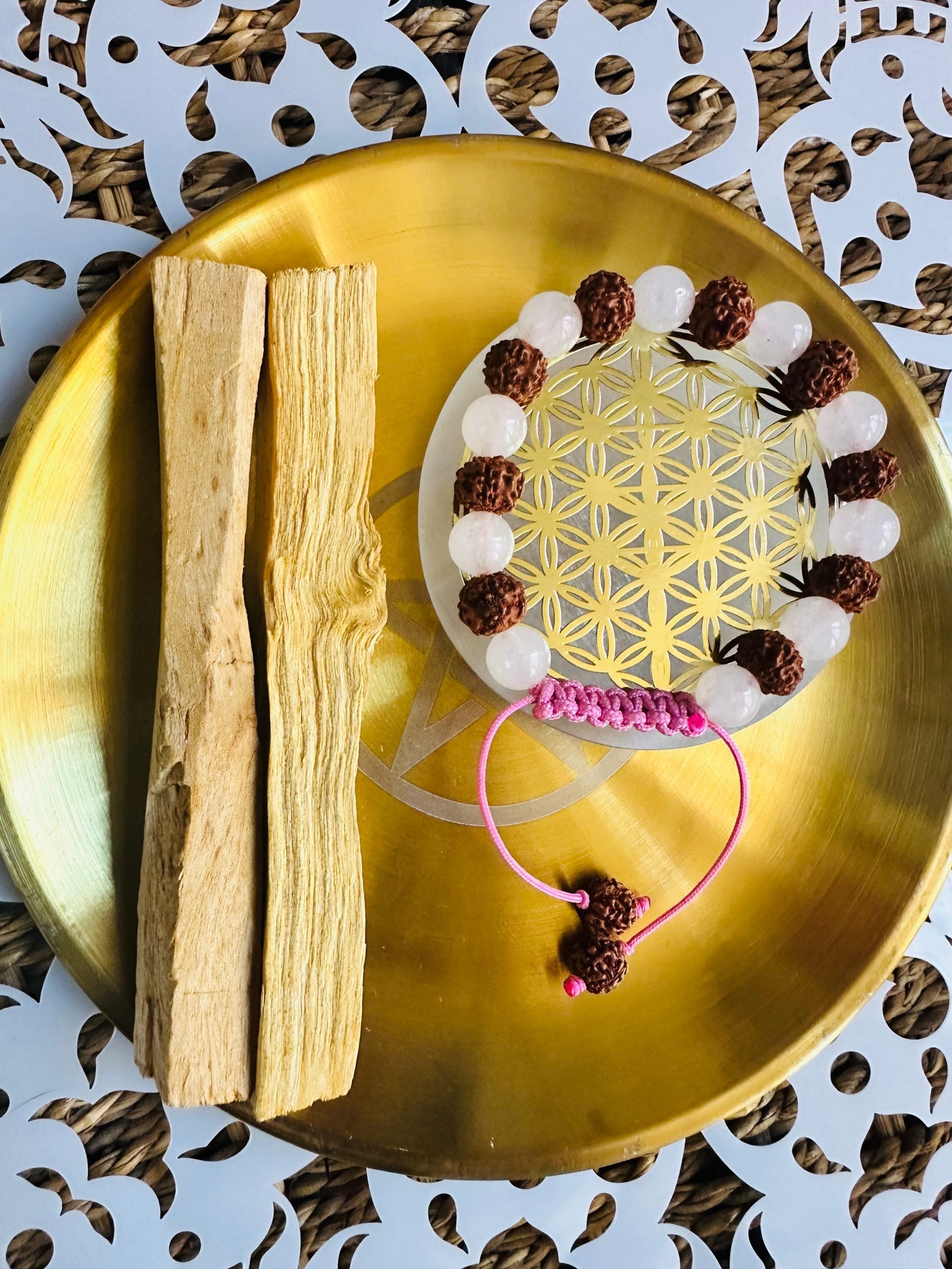 La pulsera de rudraksha y cuarzo rosa recuerda el amor propio, la compasión y la ternura en cada gesto. Cada cuenta inspira a cultivar vínculos nutritivos y emociones conscientes.