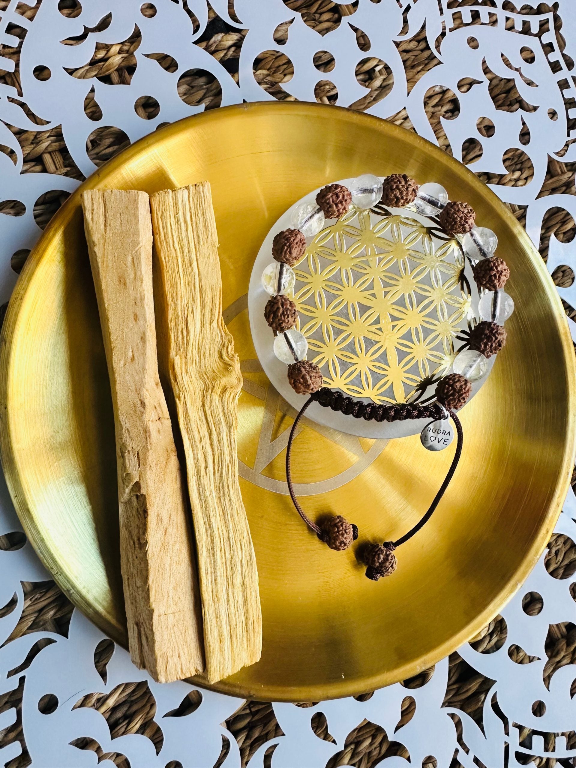 La pulsera de rudraksha y cuarzo cristal está creada para ayudarte a mantener tu centro mientras recibes nuevas oportunidades. Cada cuenta recuerda tu intención de avanzar con confianza, suavidad y equilibrio, integrando tus decisiones con tu mundo interior.