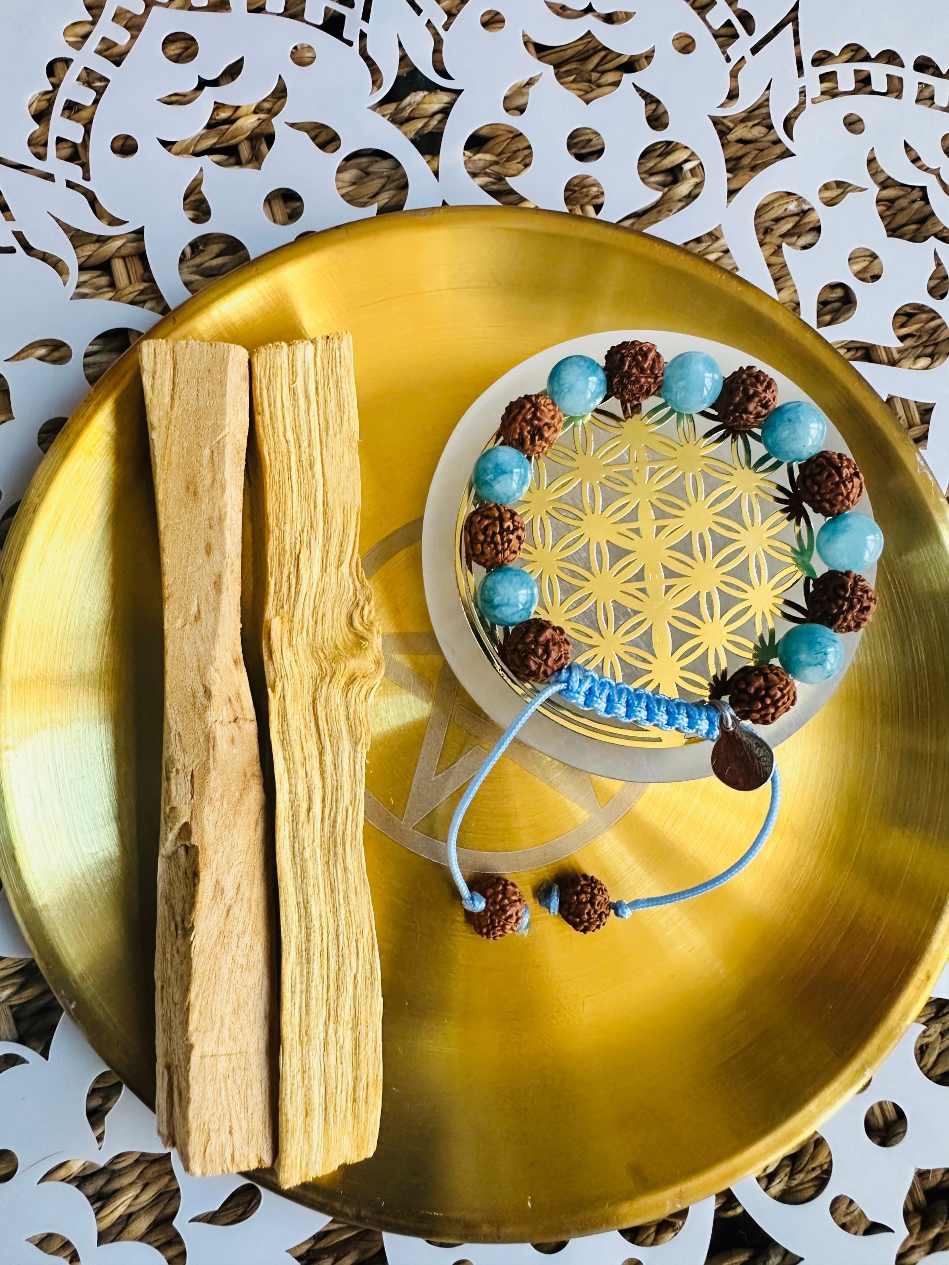 La pulsera de rudraksha y angelita recuerda que no estás solo/a: cada cuenta simboliza la presencia amorosa de tu ángel guardián y tu propia conexión con la luz interior.