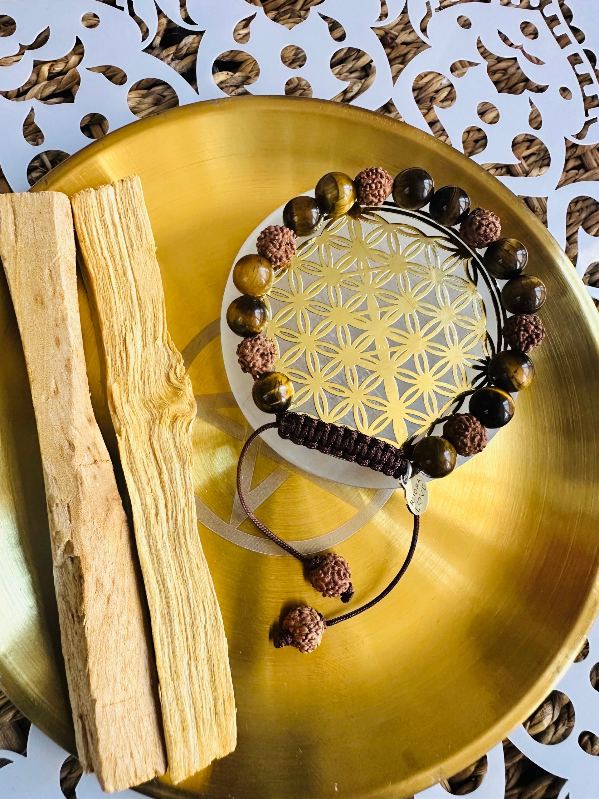 La pulsera de rudraksha y ojo de tigre recuerda tu fuerza interior, tu claridad y tu capacidad de atraer oportunidades con seguridad y enfoque.