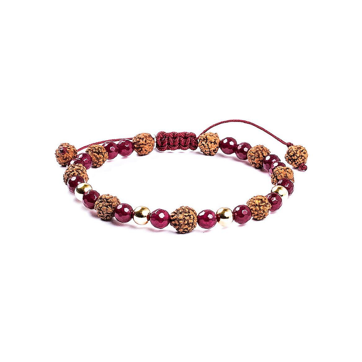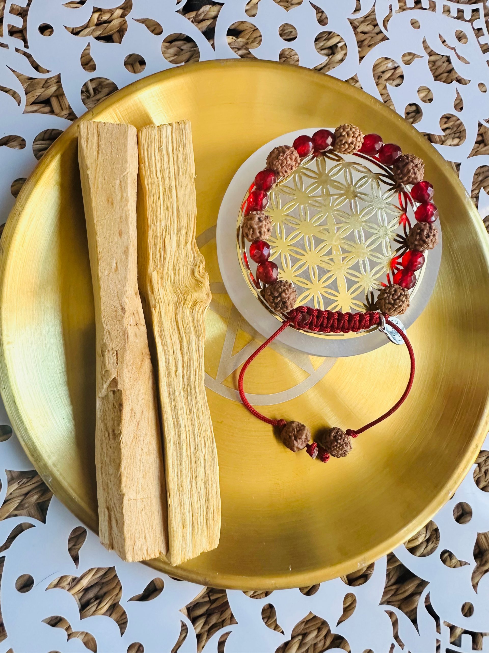 La pulsera de rubi reconstituido y rudraksha actúa como un escudo natural, recordándote tu fuerza y ayudándote a filtrar energías que no te pertenecen. Cada cuenta lleva intención y recordatorio de tu poder.