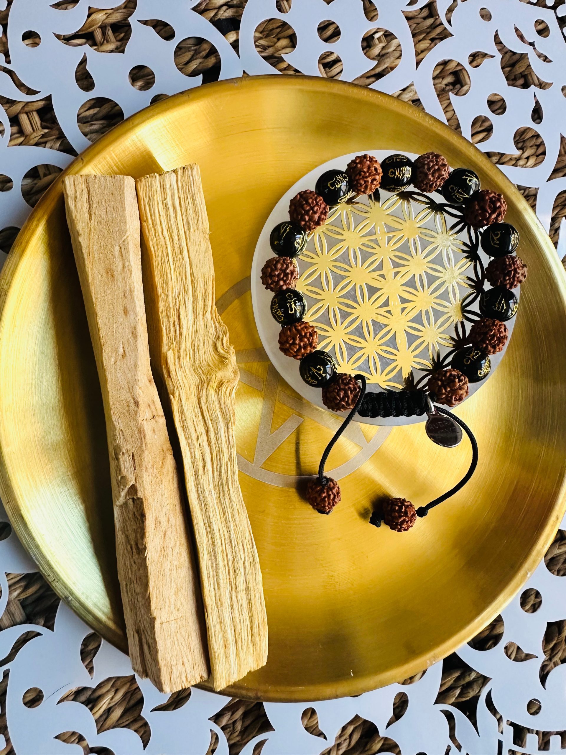 Potencia seis áreas de tu vida —protección, amor, abundancia, calma, suerte y salud— con la pulsera de rudraksha y ónix grabado con mantras. Cada cuenta lleva una intención y cada mirada recuerda tu compromiso con tu crecimiento.