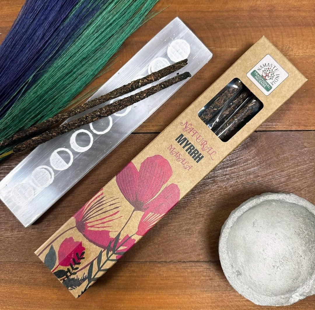 Cuando el alma pide silencio, la mirra responde. Su fragancia balsámica y sagrada ha acompañado rituales de meditación durante siglos, ayudando a abrir el corazón y elevar la conciencia. Elaborado artesanalmente con resina pura y aceites esenciales orgánicos, libre de químicos y tóxicos, este incienso Namasté India equilibra y purifica desde lo más profundo.
