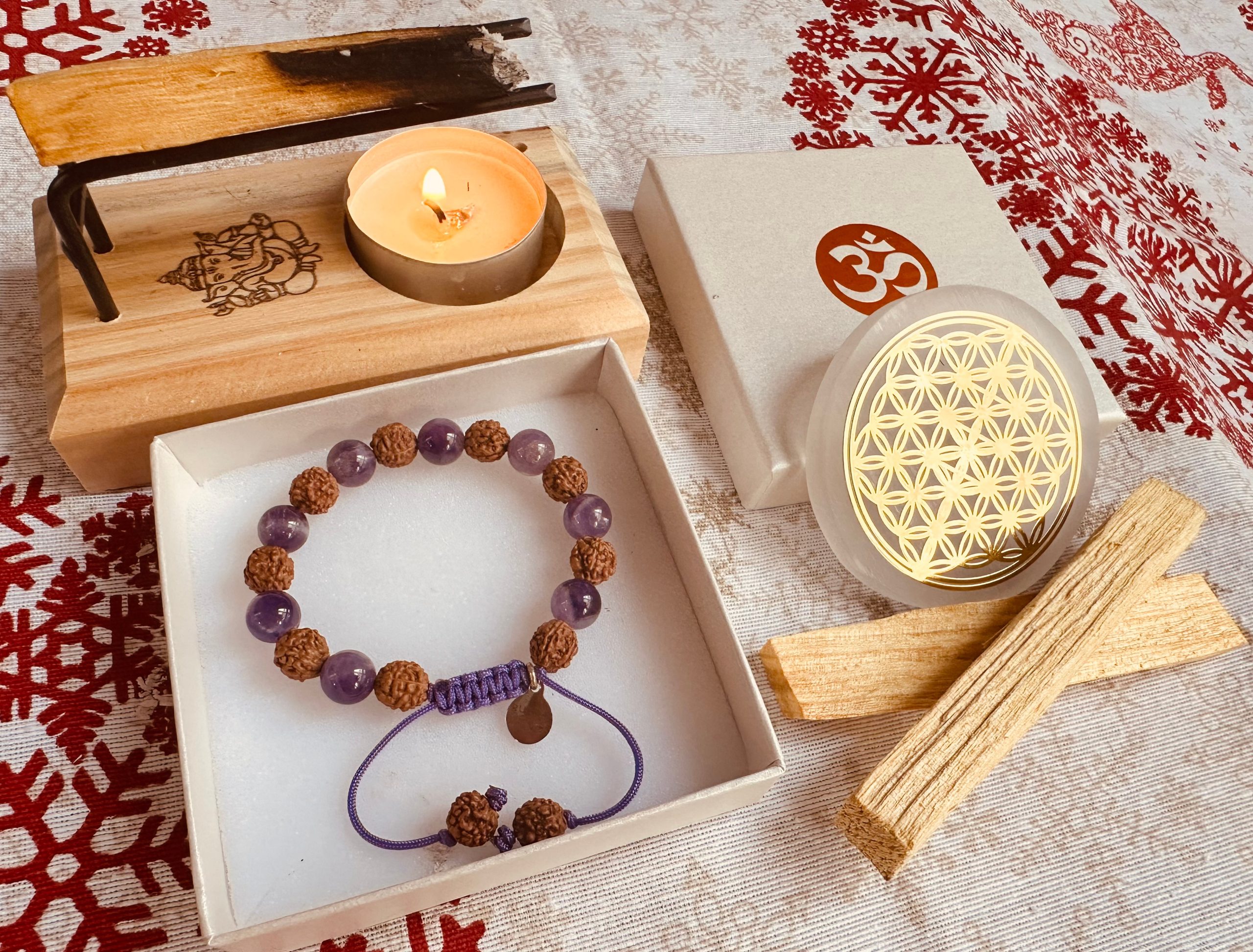 Disponible con pulsera en natural o pulsera en oro de 14k, con cuentas de plata chapadas en oro 14k, un ritual que te acompaña con intención y amor propio.