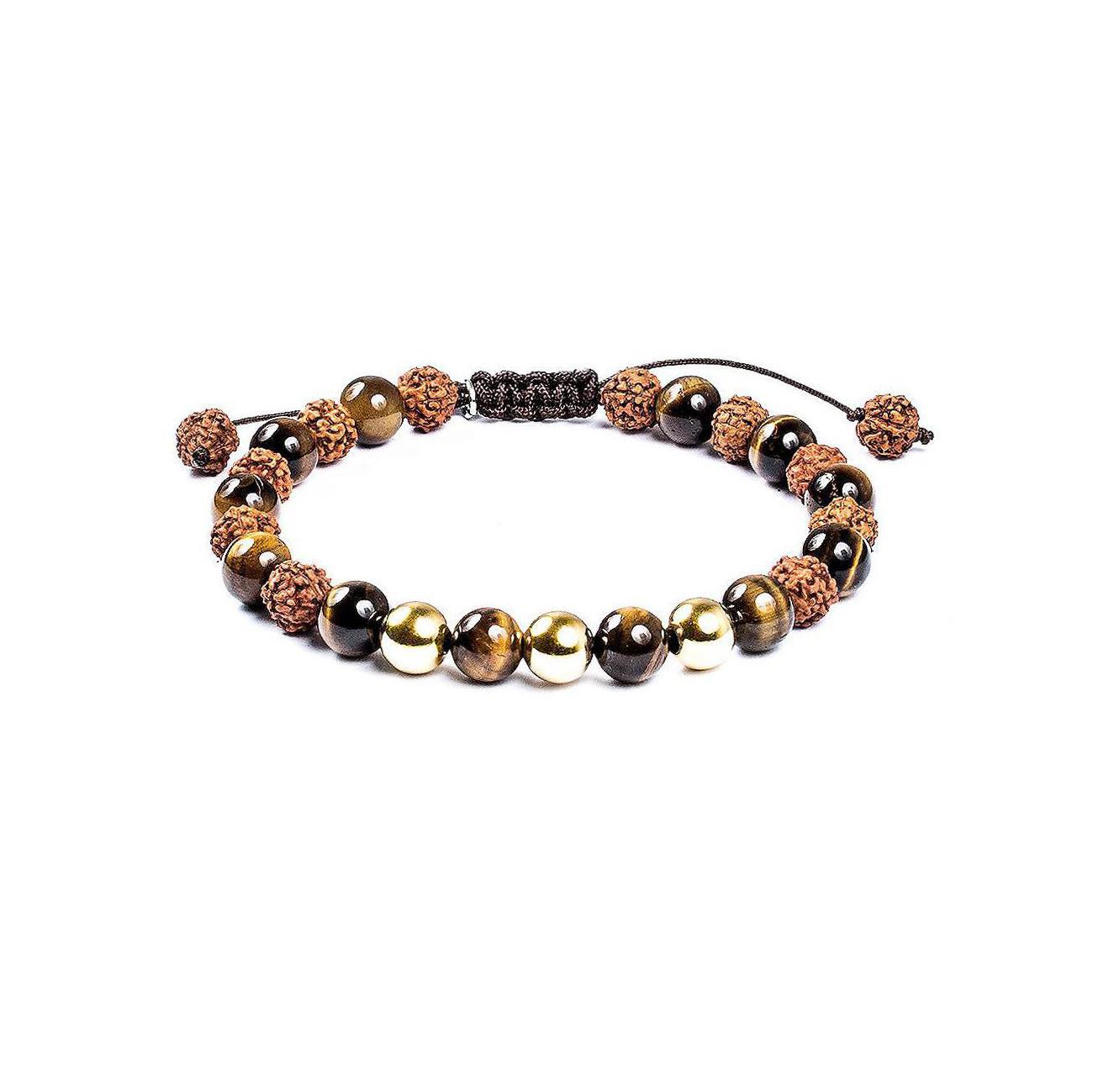 Pulsera artesanal con rudraksha y ojo de tigre.